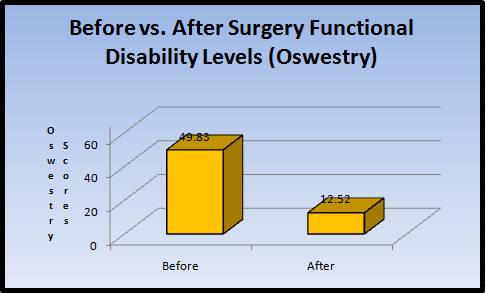 With regard to the Oswestry scores (see below), a median improvement of 76% was recorded (49.83 to 12.52, p=0001).
